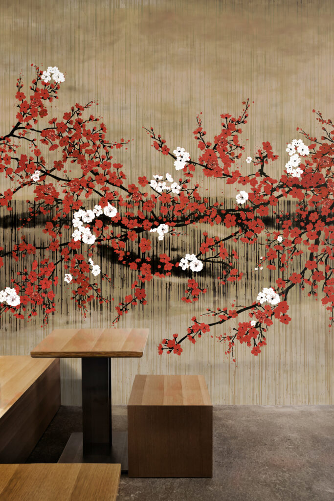 A daisy james wallcovering from “the Bliss” series, where serenity merges with striking contrast. This edition features a natural, earthy background with a soft horizon line that creates depth and calm enriched with warm red tones and subtle accents that evoke the feel of refined, hand-painted detail. The composition radiates understated elegance, with a gentle nod to Japanese aesthetics. Designed for those with an eye for detail and sophistication, this wallcovering offers a perfect harmony of warmth and clarity, subtlety and presence. “The Bliss Natural Red” transforms your wall into a quiet, expressive statement — seamless, stylish, and timelessly serene.