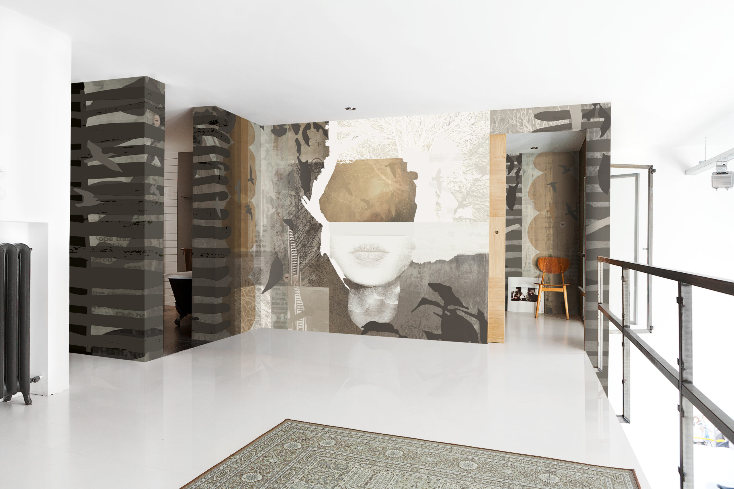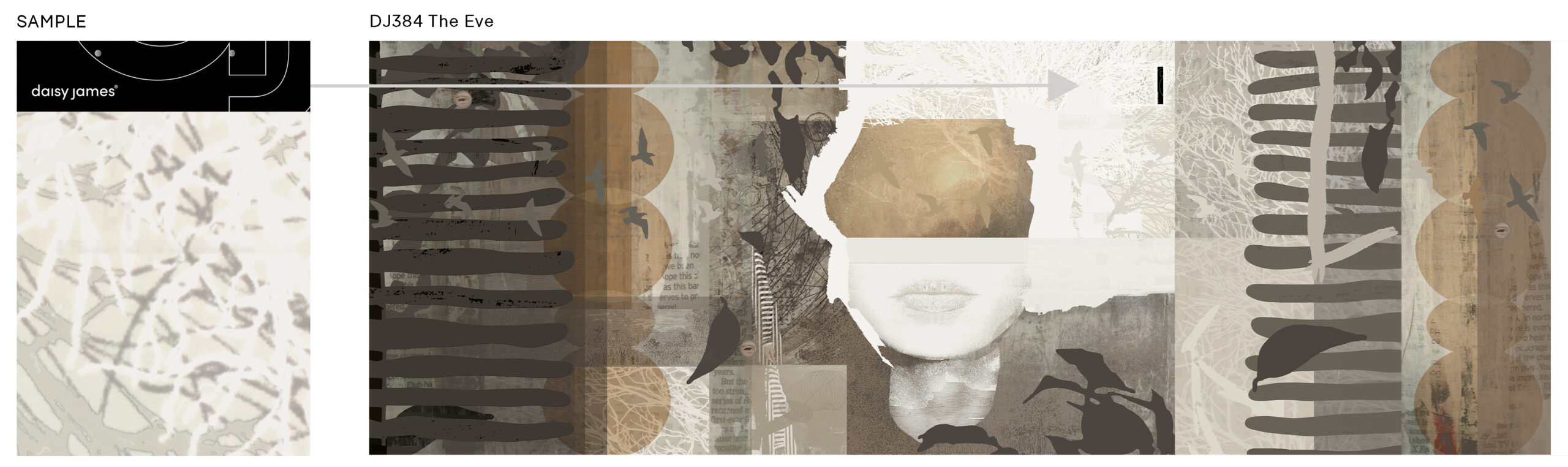 Add a refined, natural touch to your interior with “The Eve”, an abstract natural wallcovering by daisy james. This seamless design subtly reveals a face within abstract shapes, warm ochre tones, soft circles, and stylized leaves. Abstract birds elegantly weave through the pattern, bringing a playful and organic feel to your space. Inspired by the…