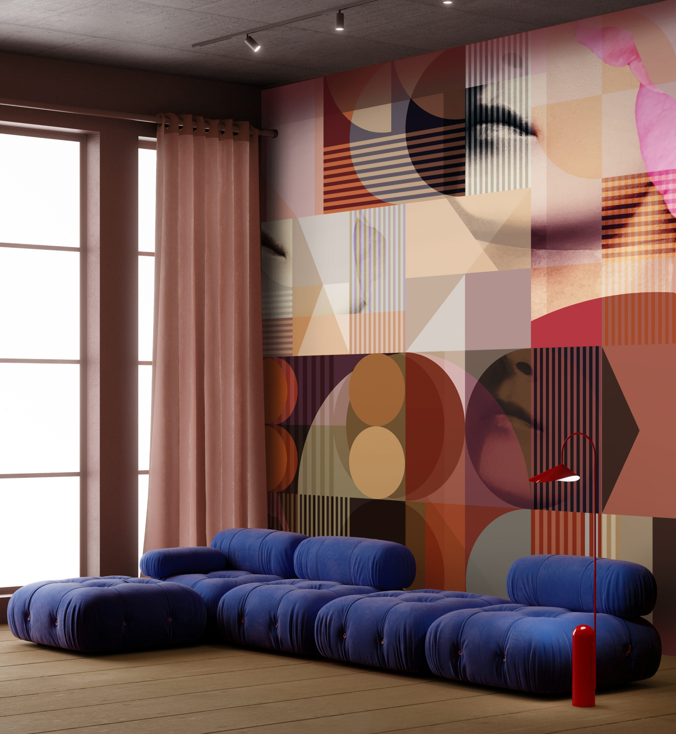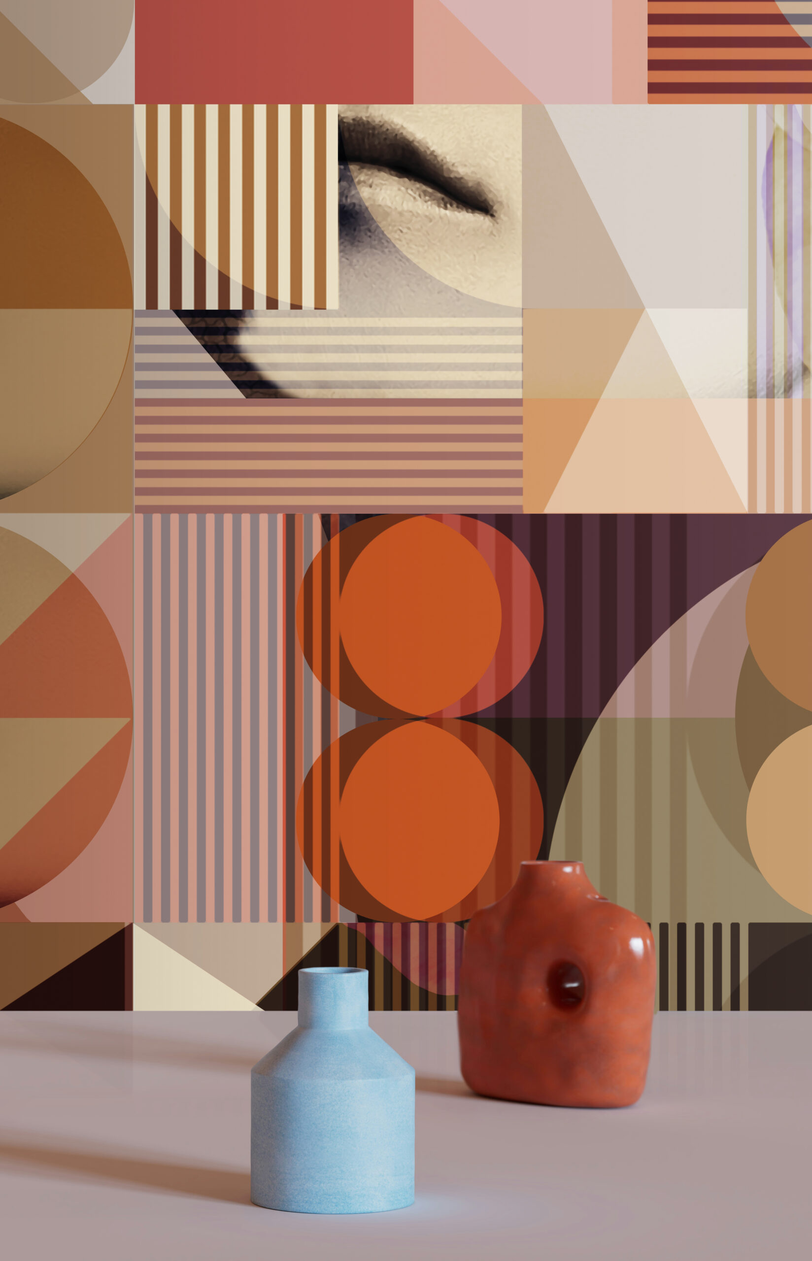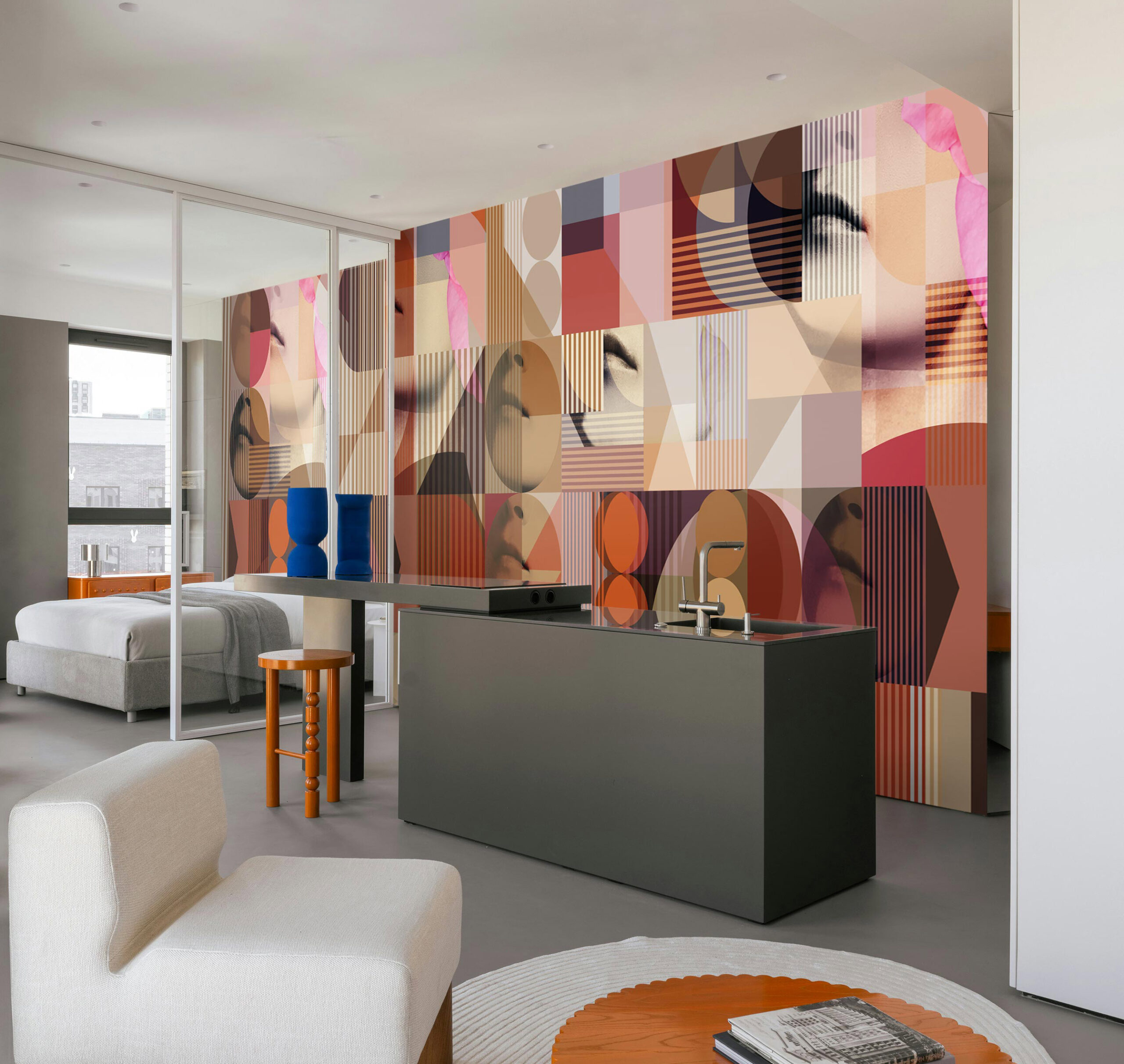 Wallcover “The Coral” by daisy james is a Contemporary abstract wallcover in warm orange-red tones with graphic shapes and subtle facial fragments. The composition balances rounded and angular forms, creating a layered surface with a clear visual structure. Designed to function as a refined accent, “The Coral” adds a modern and distinctive character to contemporary interiors.