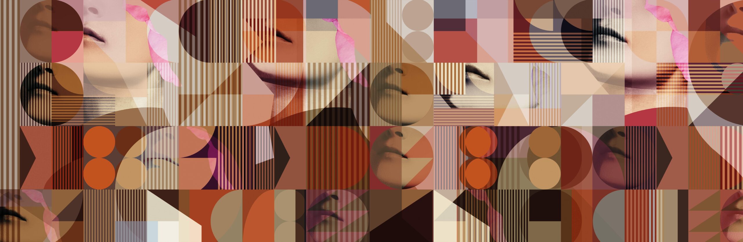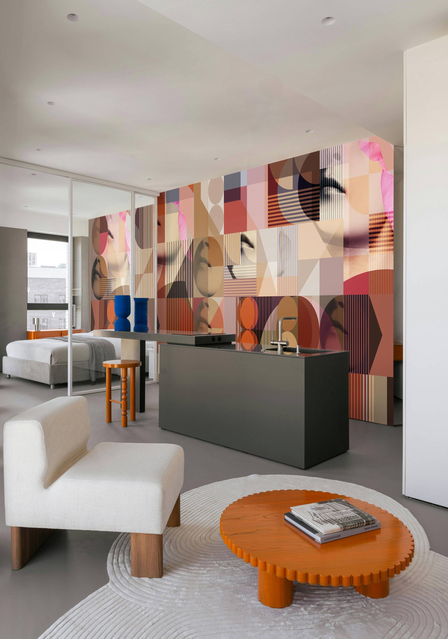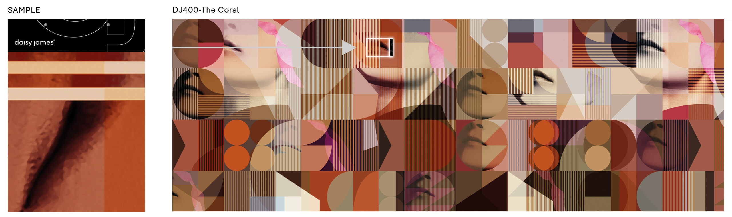 Wallcover “The Coral” by daisy james is a Contemporary abstract wallcover in warm orange-red tones with graphic shapes and subtle facial fragments. The composition balances rounded and angular forms, creating a layered surface with a clear visual structure. Designed to function as a refined accent, “The Coral” adds a modern and distinctive character to contemporary interiors.