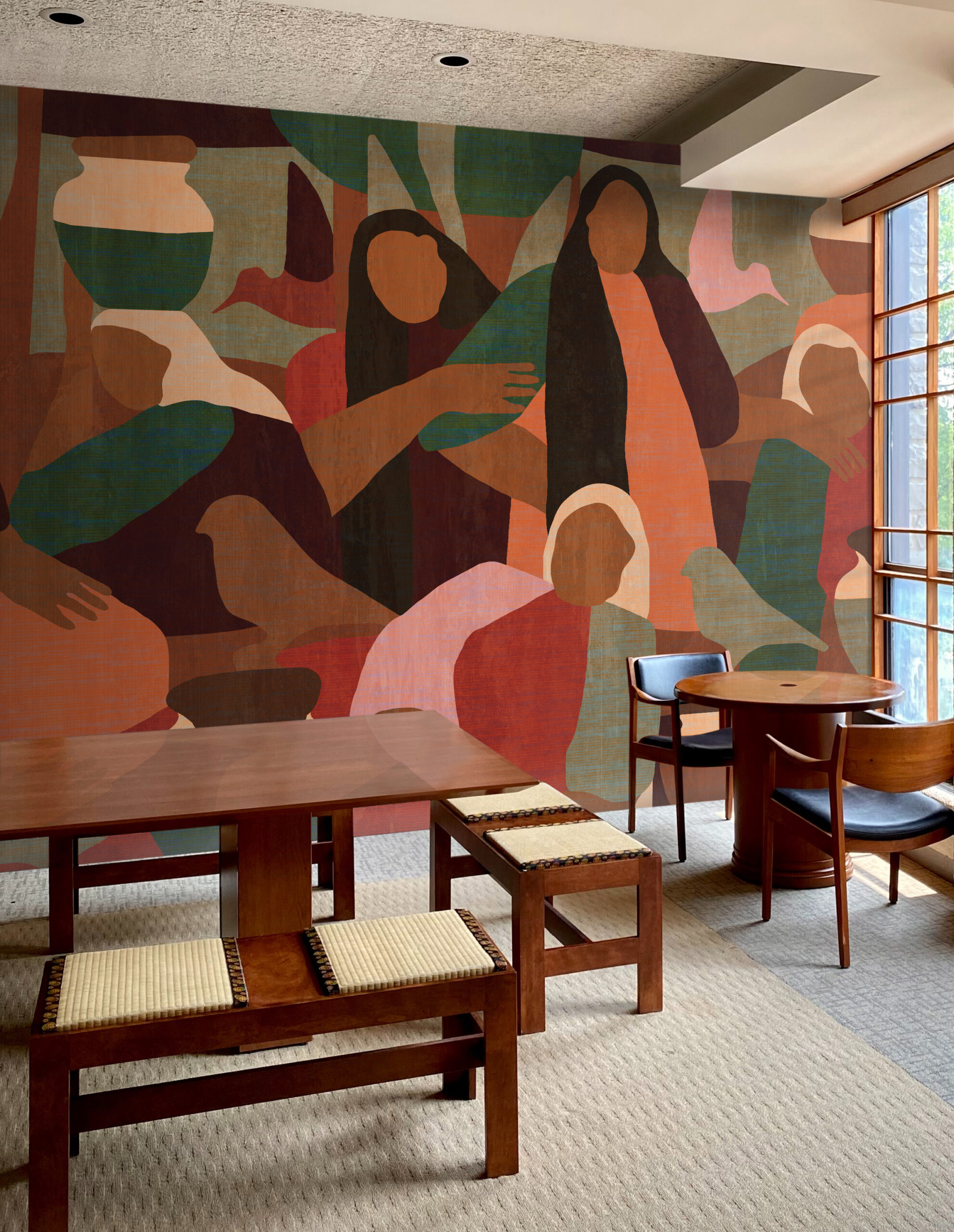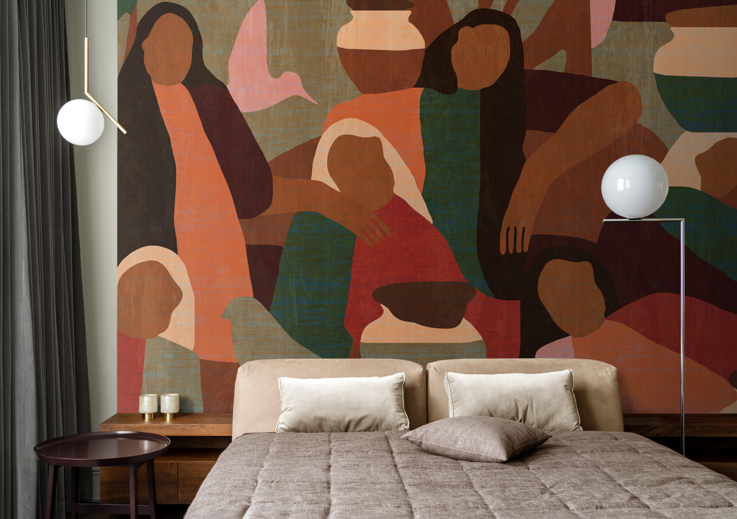 - Keep furniture and accessories calm in earthy tones or soft neutrals, allowing the design wallcover to remain the focal point.