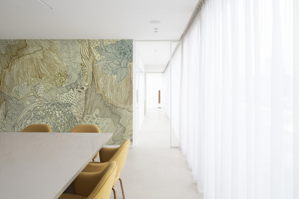 A workspace should inspire curiosity and focus. At daisy james, we design wallcoverings with intriguing patterns that invite a second look. From a distance, they appear as elegant, harmonious designs but up close, subtle details emerge: shapes, textures and hidden elements that reveal a new story every time. These multi-layered patterns are perfect for workspaces where creativity and concentration go hand in hand. They stimulate the imagination without overwhelming the space, creating an environment that feels both professional and inspiring. With seamless execution and refined detail, our wallcoverings turn every wall into a canvas that is stylish from afar and fascinating up close.